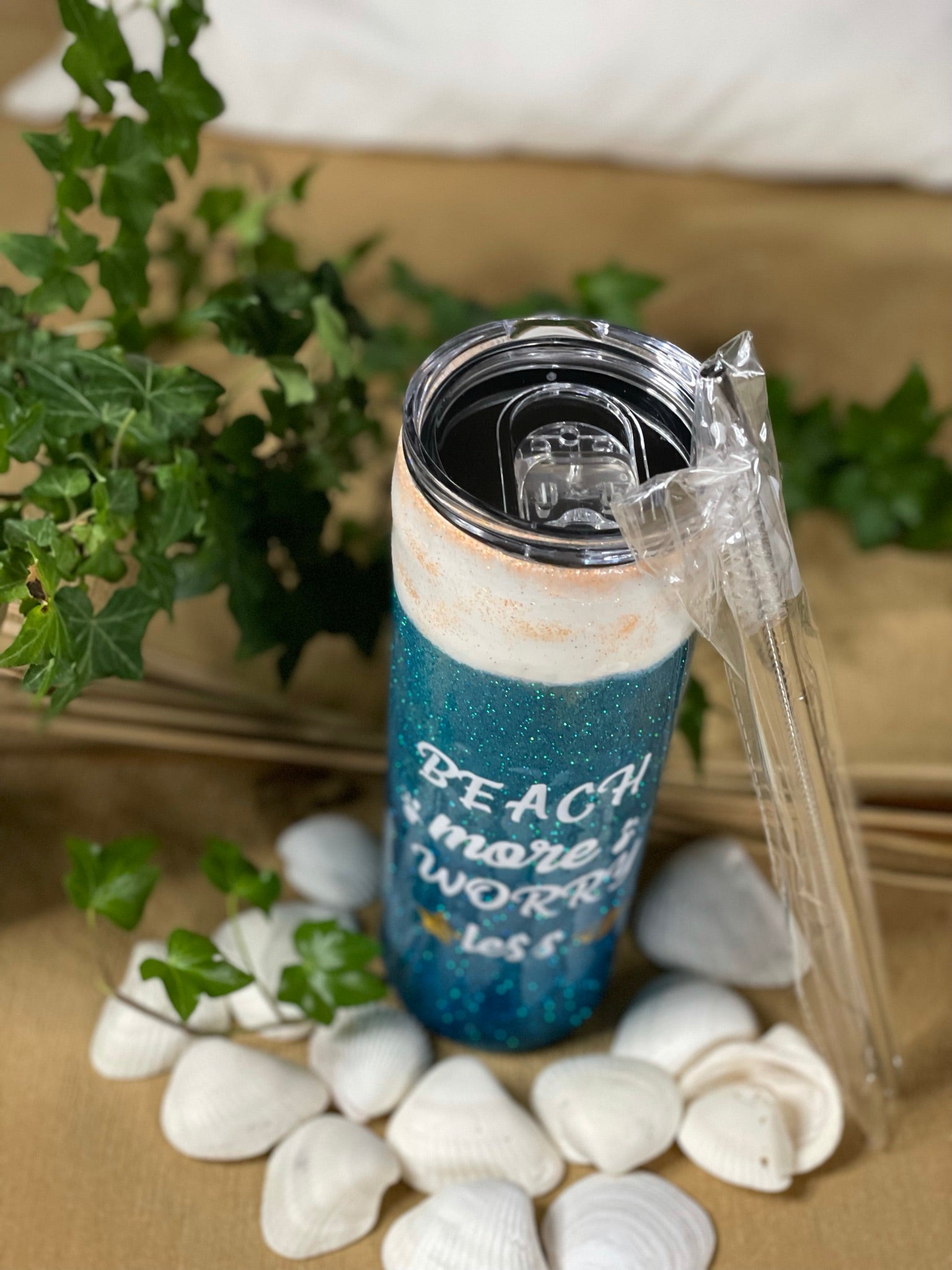 Beach 20 ounce Tumbler. Comes with reusable straw and straw cleaning brush.