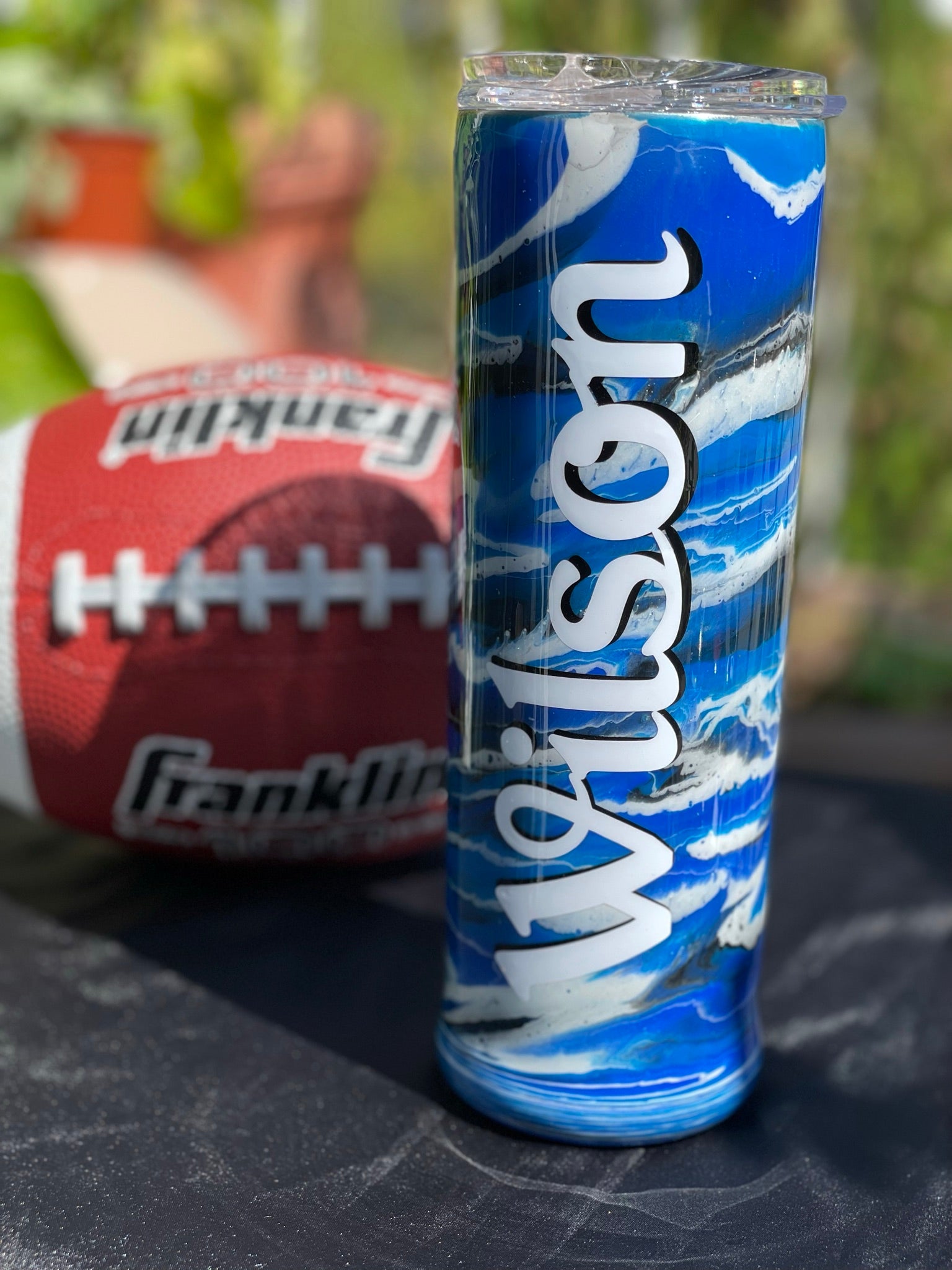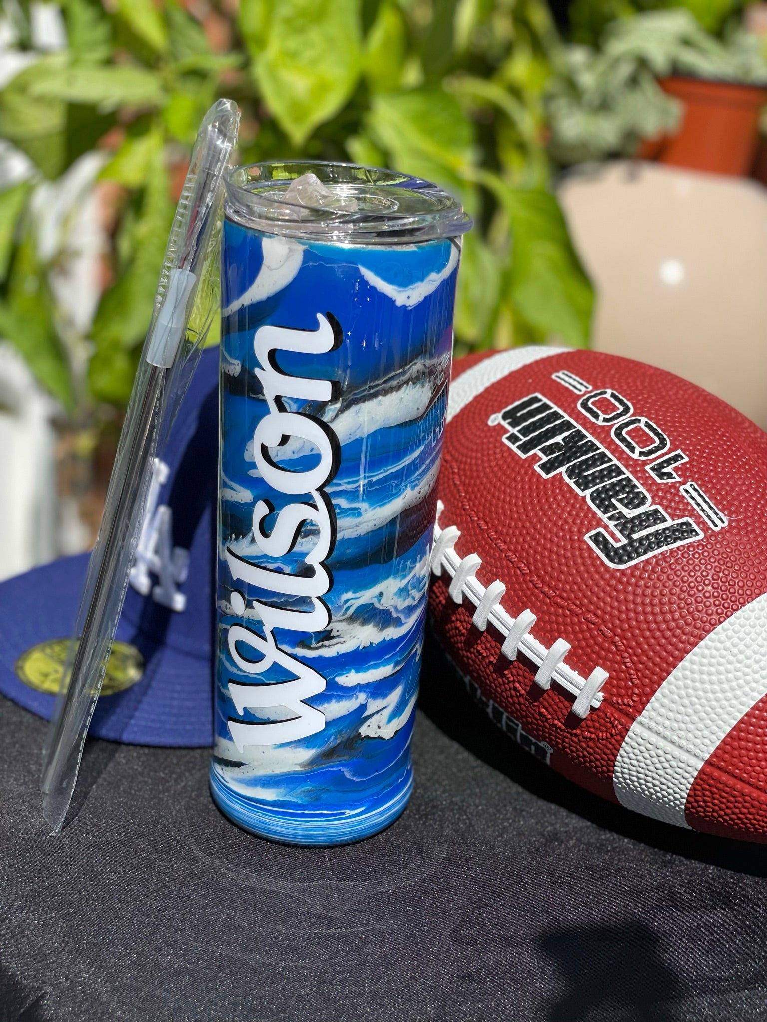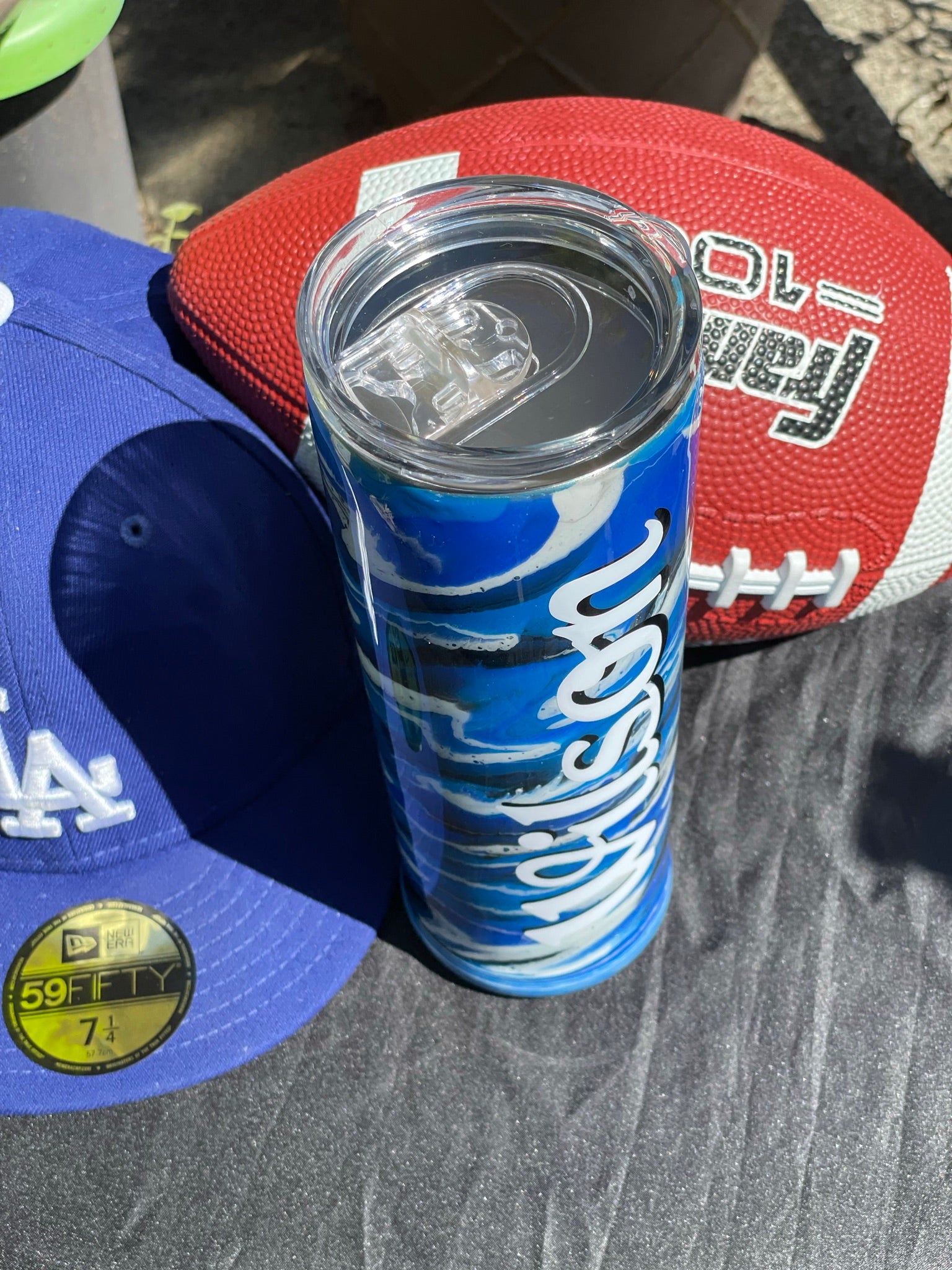 Blue, Black & White Swirl 20 ounce Tumbler. Comes with reusable straw and straw cleaning brush.