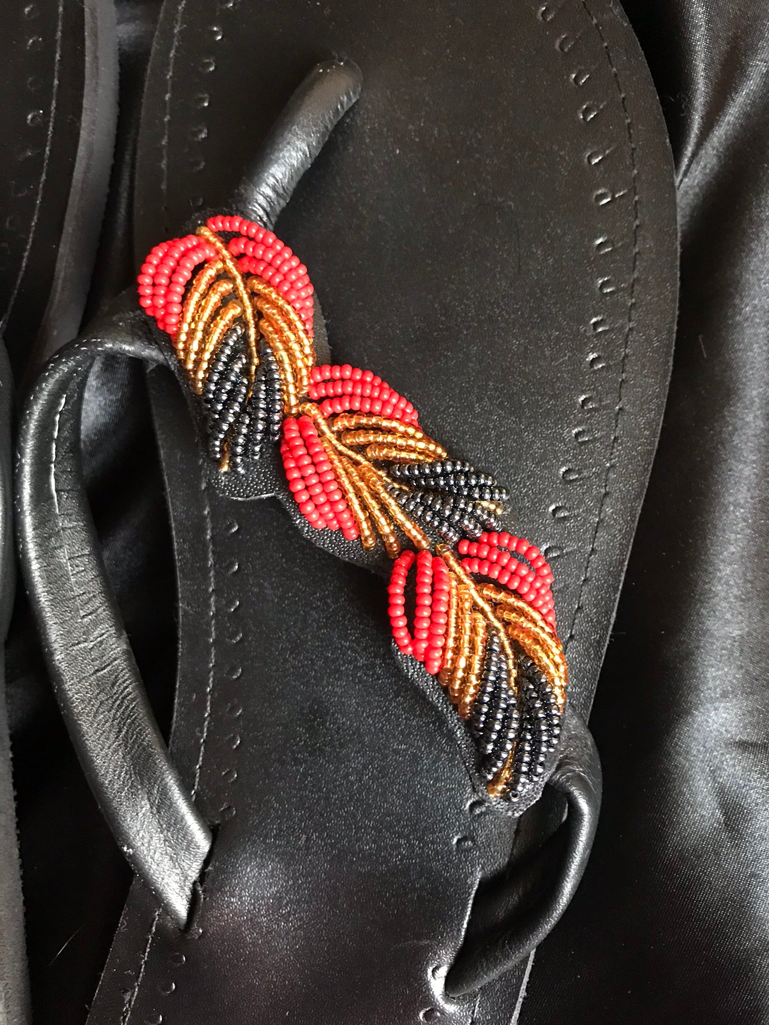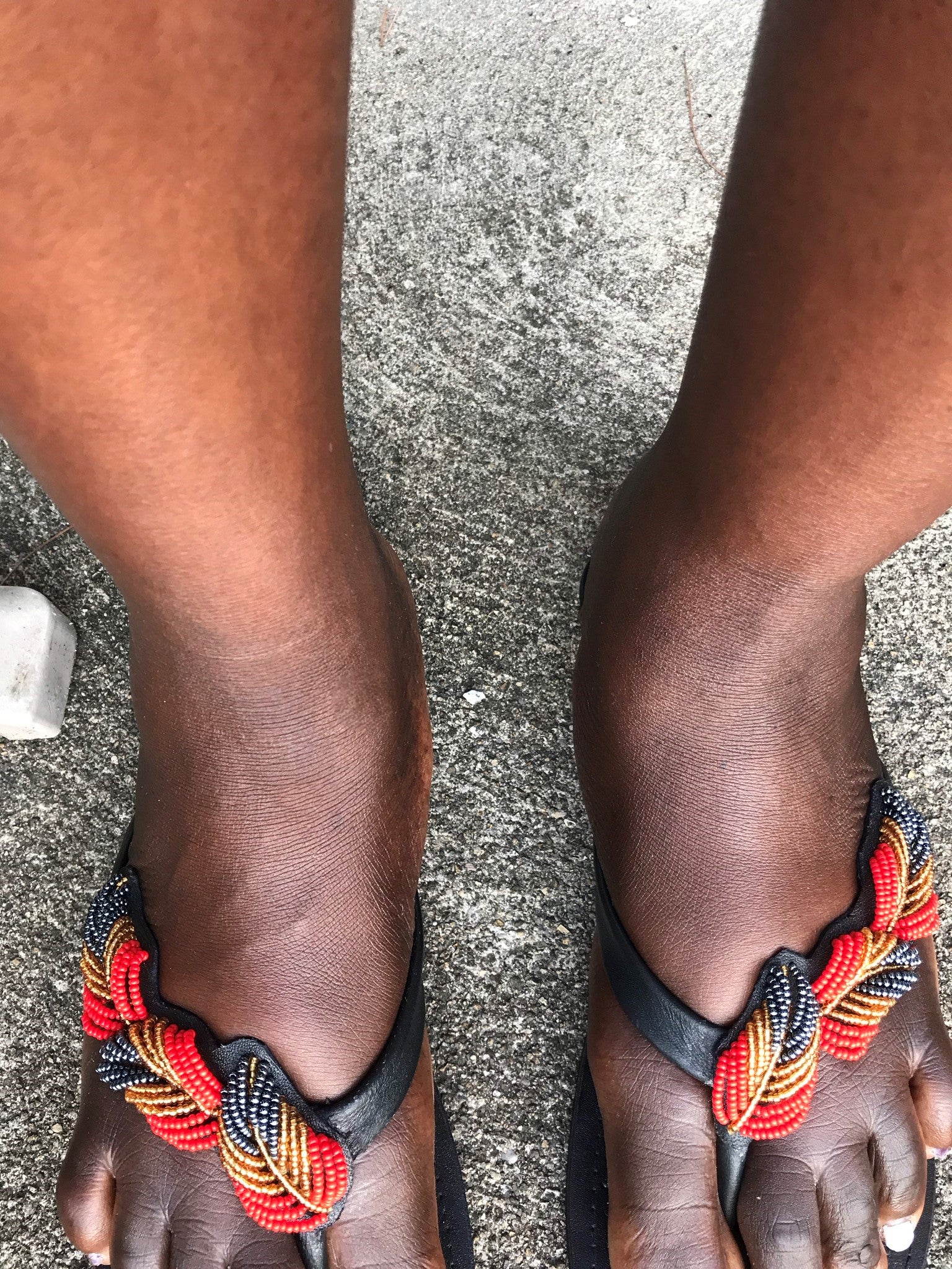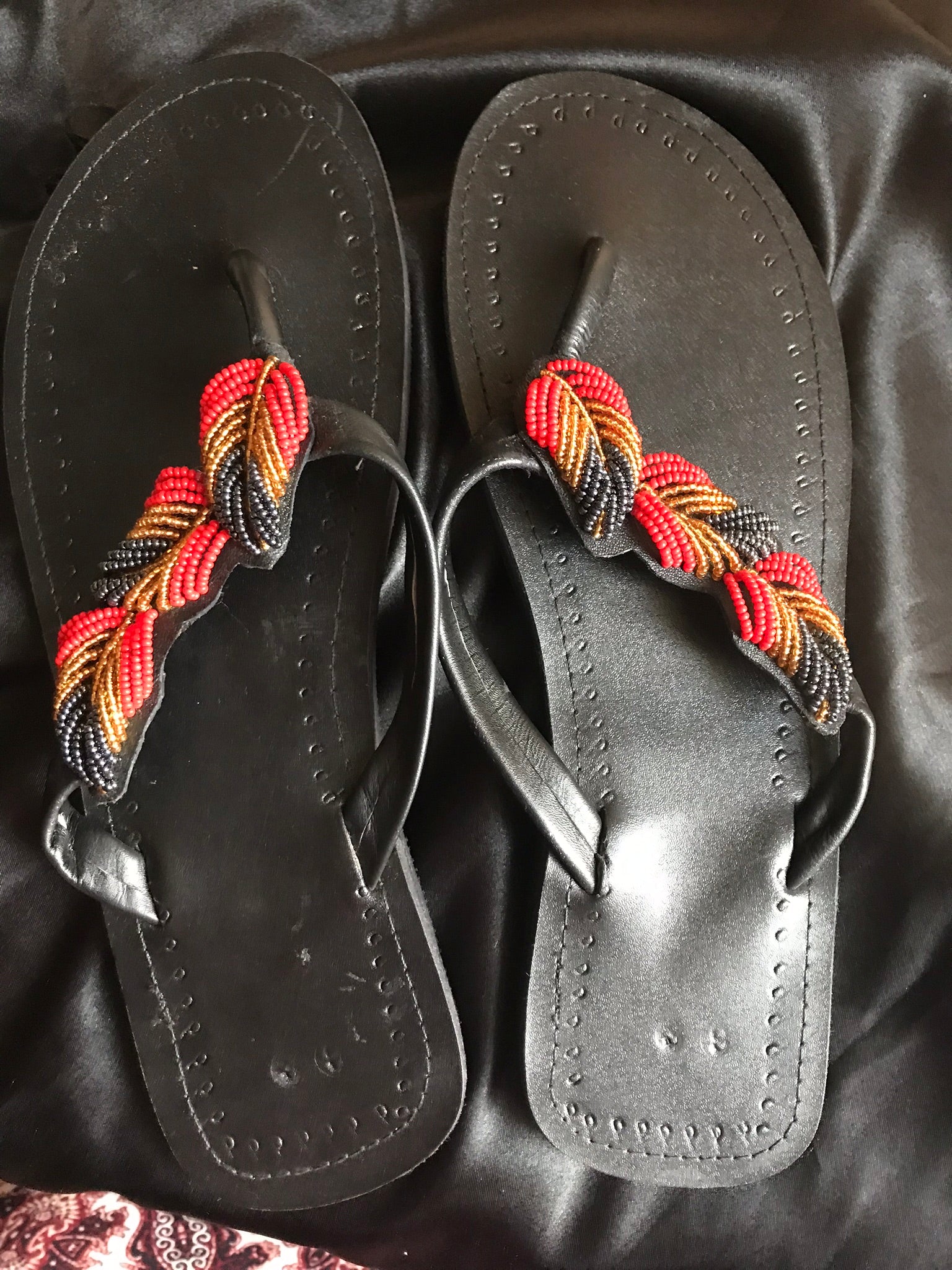 Authentic handmade Ugandan Sandals. Intricately made with different colored beads in the shape of leaves. Great way to dress up any out fit while staying comfortable.