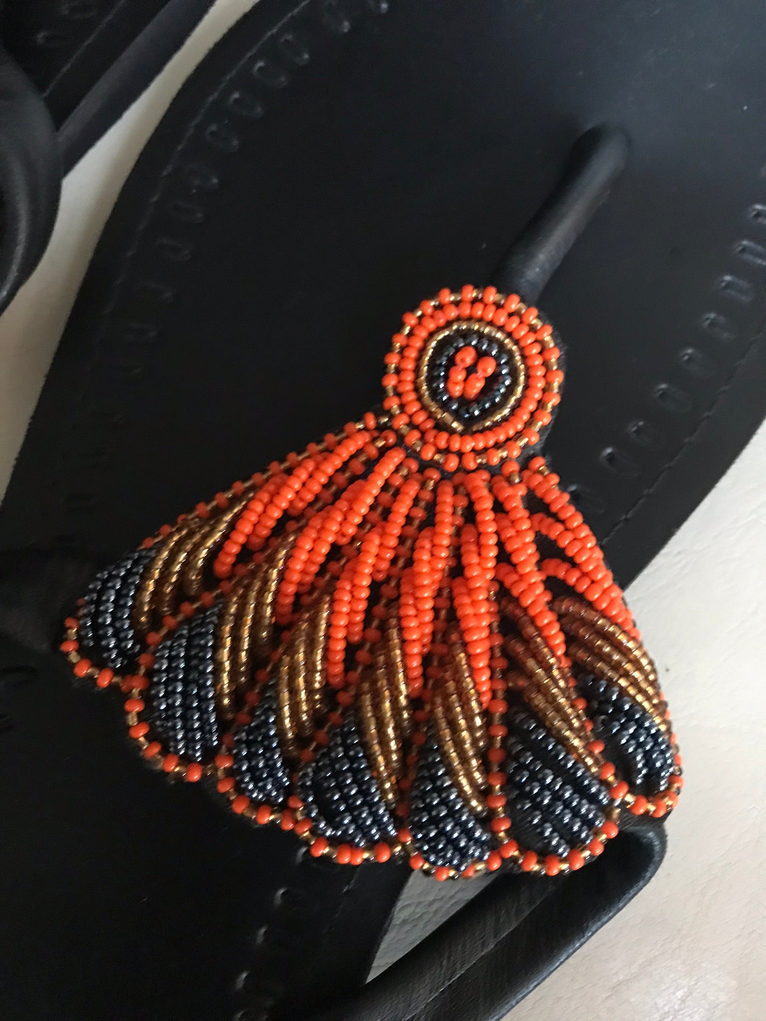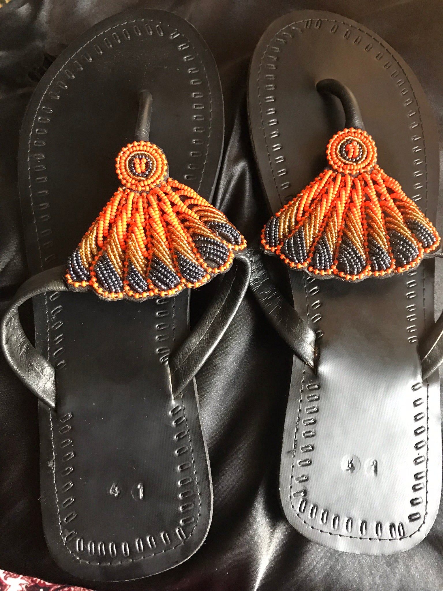 Authentic handmade leather Ugandan Sandals. Intricately made with different colored beads in the shape of a butterfly wing. Great way to dress up any out fit while staying comfortable.