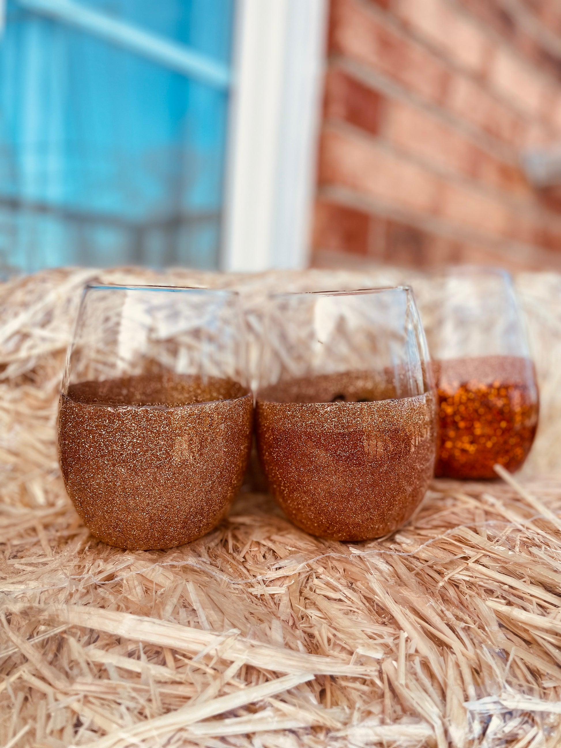 Gold glittered wine glass with music notes inside .