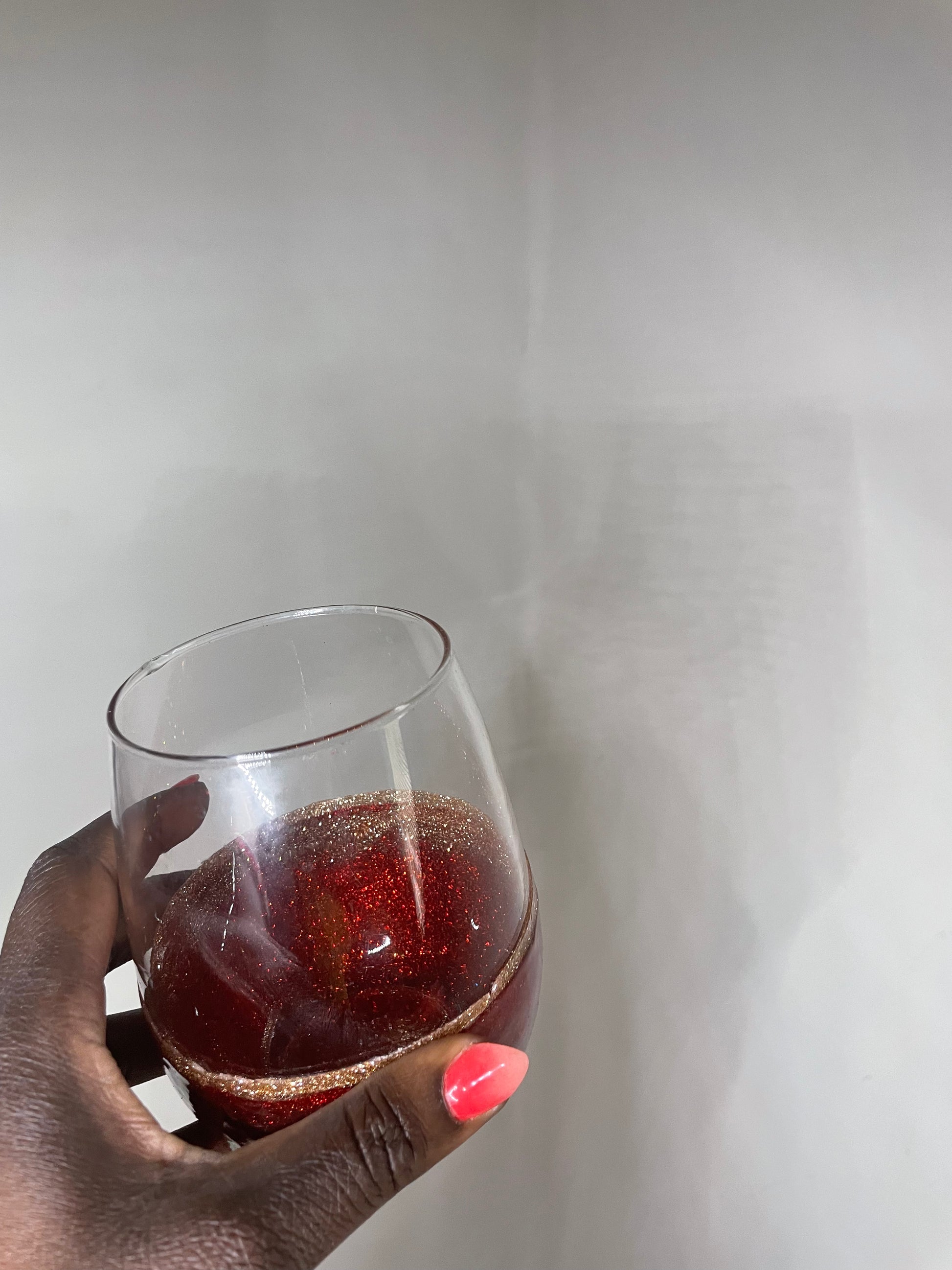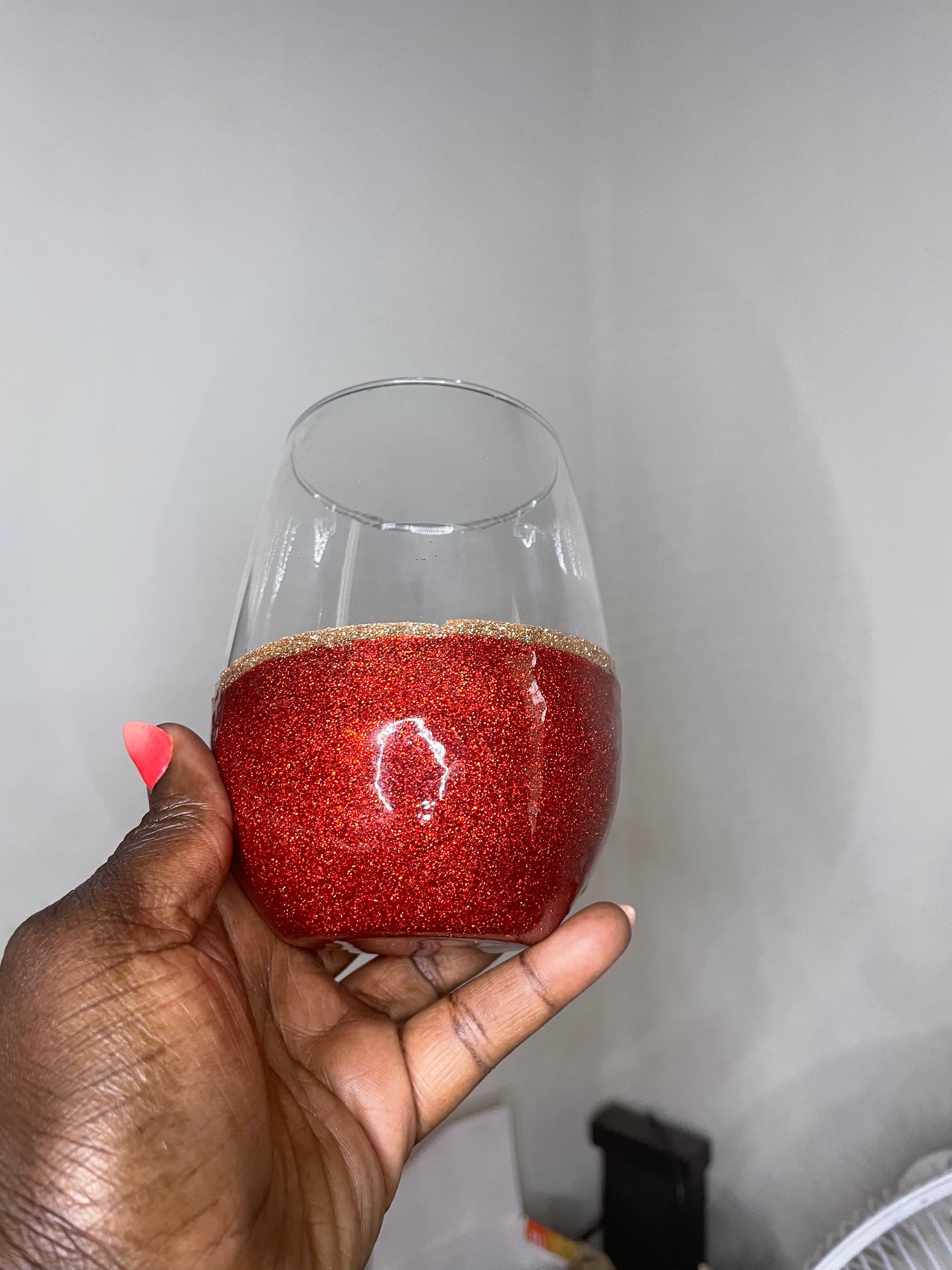 Red glittered no stem wine glass topped with gold glittered. Perfect touch of color for this customized glass.